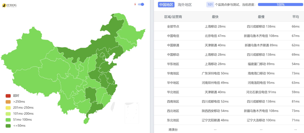 The average latency across China is around 66ms, showing that MOACK’s CN2 optimized network performs very well for China access.