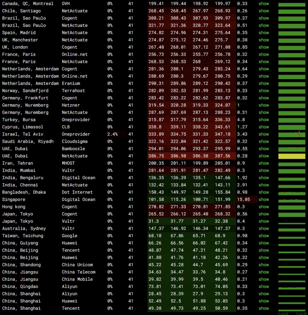 Testing results show that the server is very stable for both China nodes and overseas nodes, with almost no packet loss. Only a few foreign nodes occasionally show minor loss.