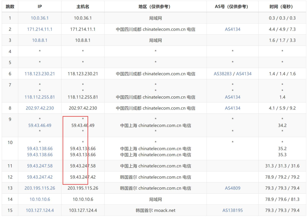 - China Telecom: 59.43 CN2 optimized route from Shanghai to Seoul